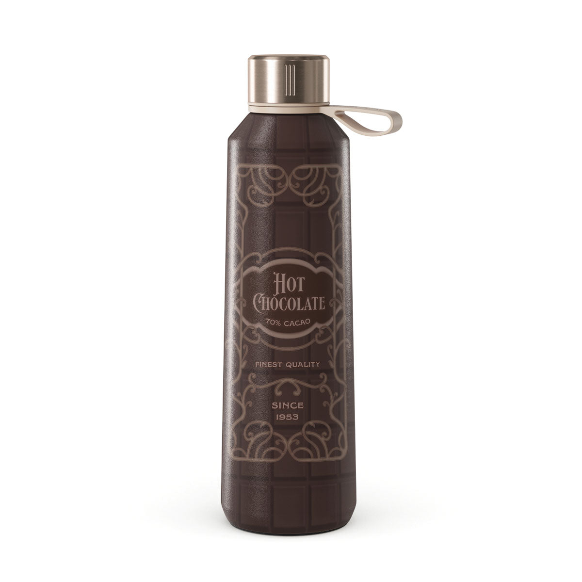 This design features: hot chocolate label, brown chocolate design, retro packaging style