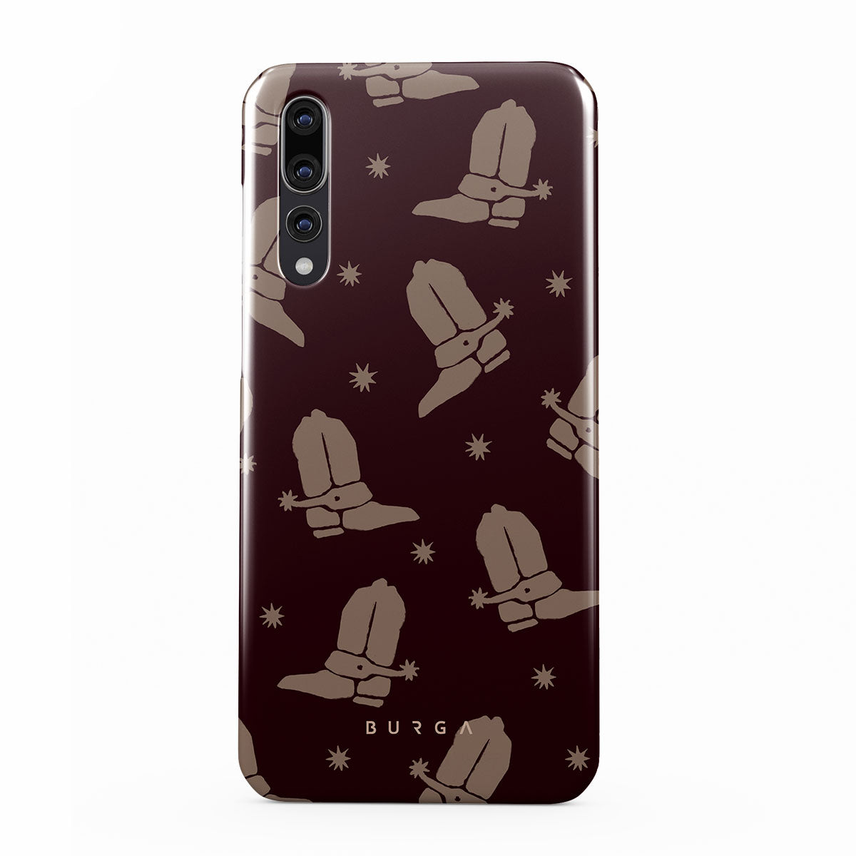 Say Howdy to this charming Huawei P20 phone case design. Cowboy boots and stars dance across a deep brown background, celebrating the essence of western life. Perfect for those who embrace their free spirit.