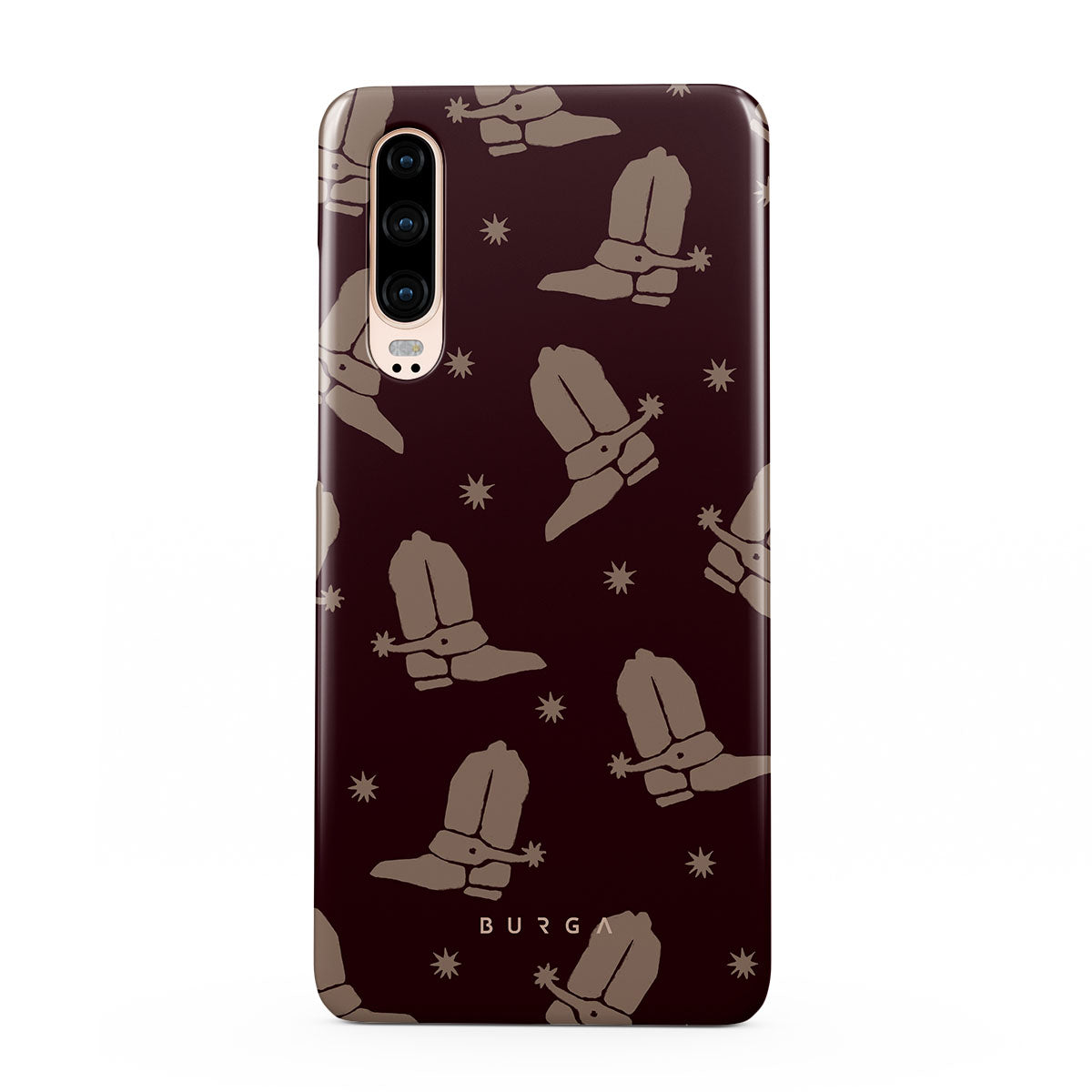 Say Howdy to this charming Huawei P30 phone case design. Cowboy boots and stars dance across a deep brown background, celebrating the essence of western life. Perfect for those who embrace their free spirit.
