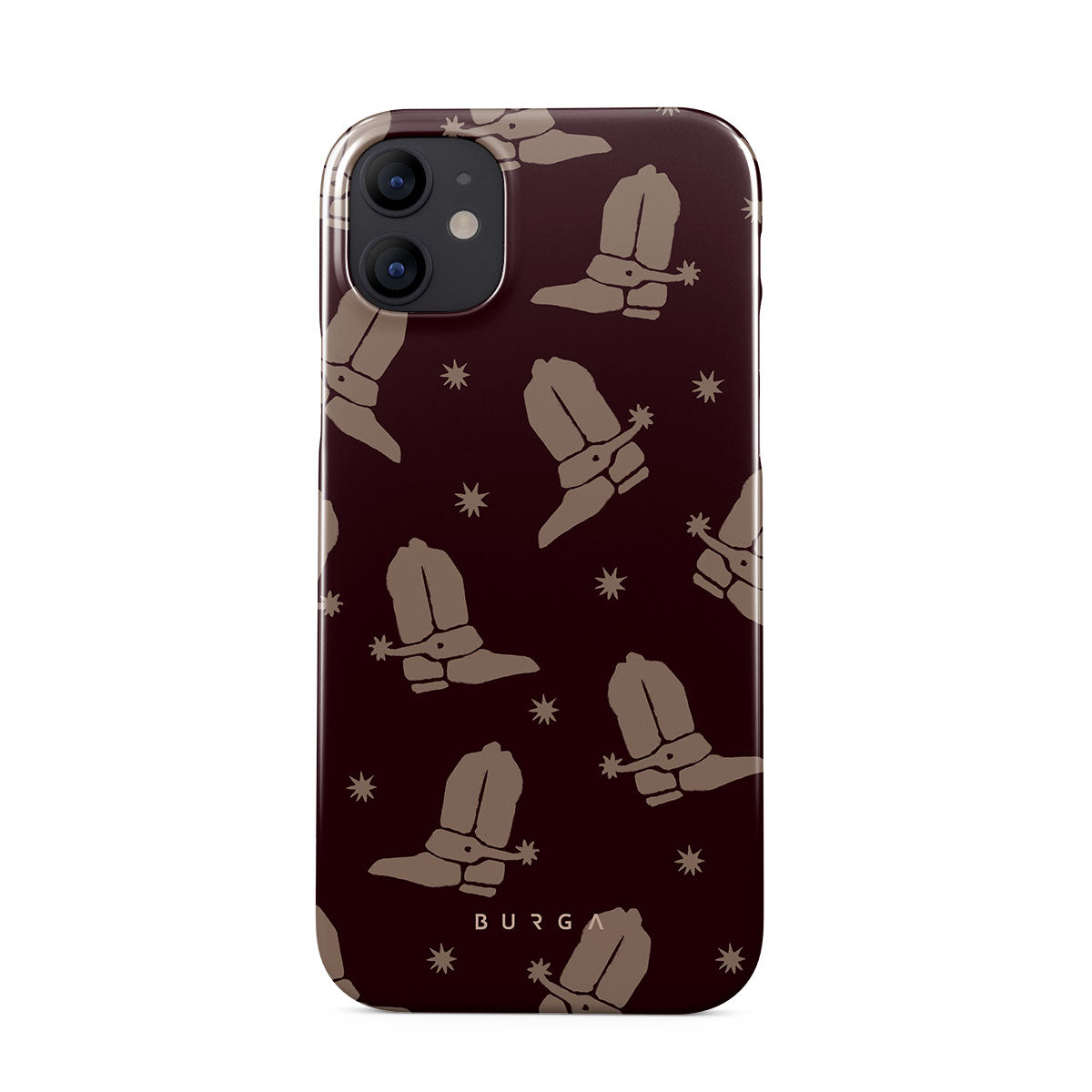 Say Howdy to this charming iPhone 12 Mini phone case design. Cowboy boots and stars dance across a deep brown background, celebrating the essence of western life. Perfect for those who embrace their free spirit.