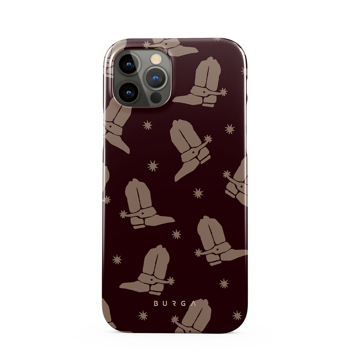 Say Howdy to this charming iPhone 12 Pro Max phone case design. Cowboy boots and stars dance across a deep brown background, celebrating the essence of western life. Perfect for those who embrace their free spirit.