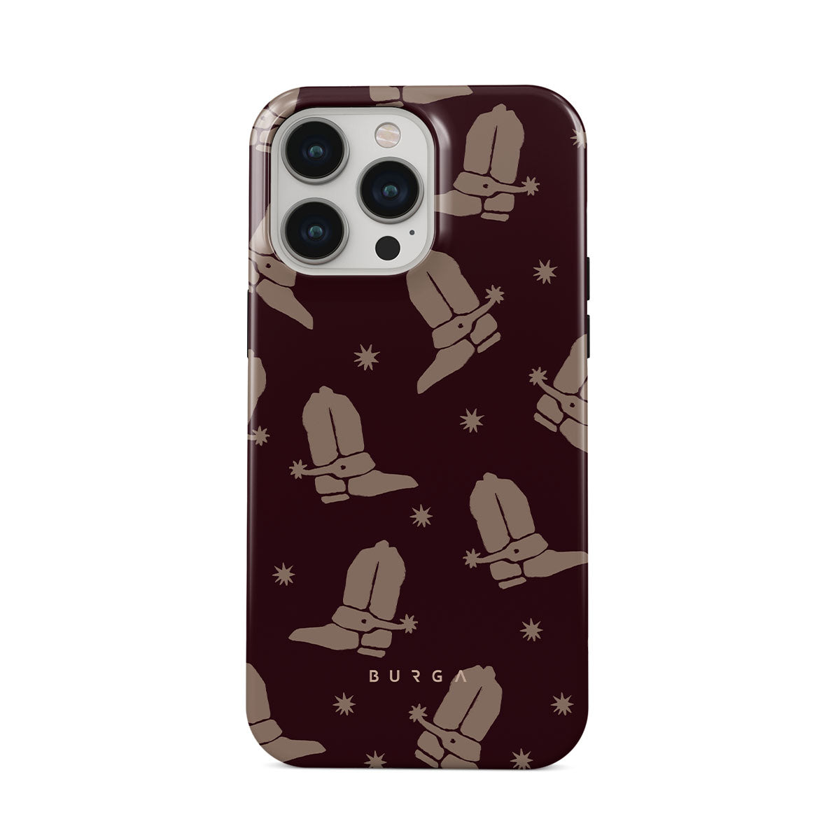 Say Howdy to this charming iPhone 14 Pro phone case design. Cowboy boots and stars dance across a deep brown background, celebrating the essence of western life. Perfect for those who embrace their free spirit.