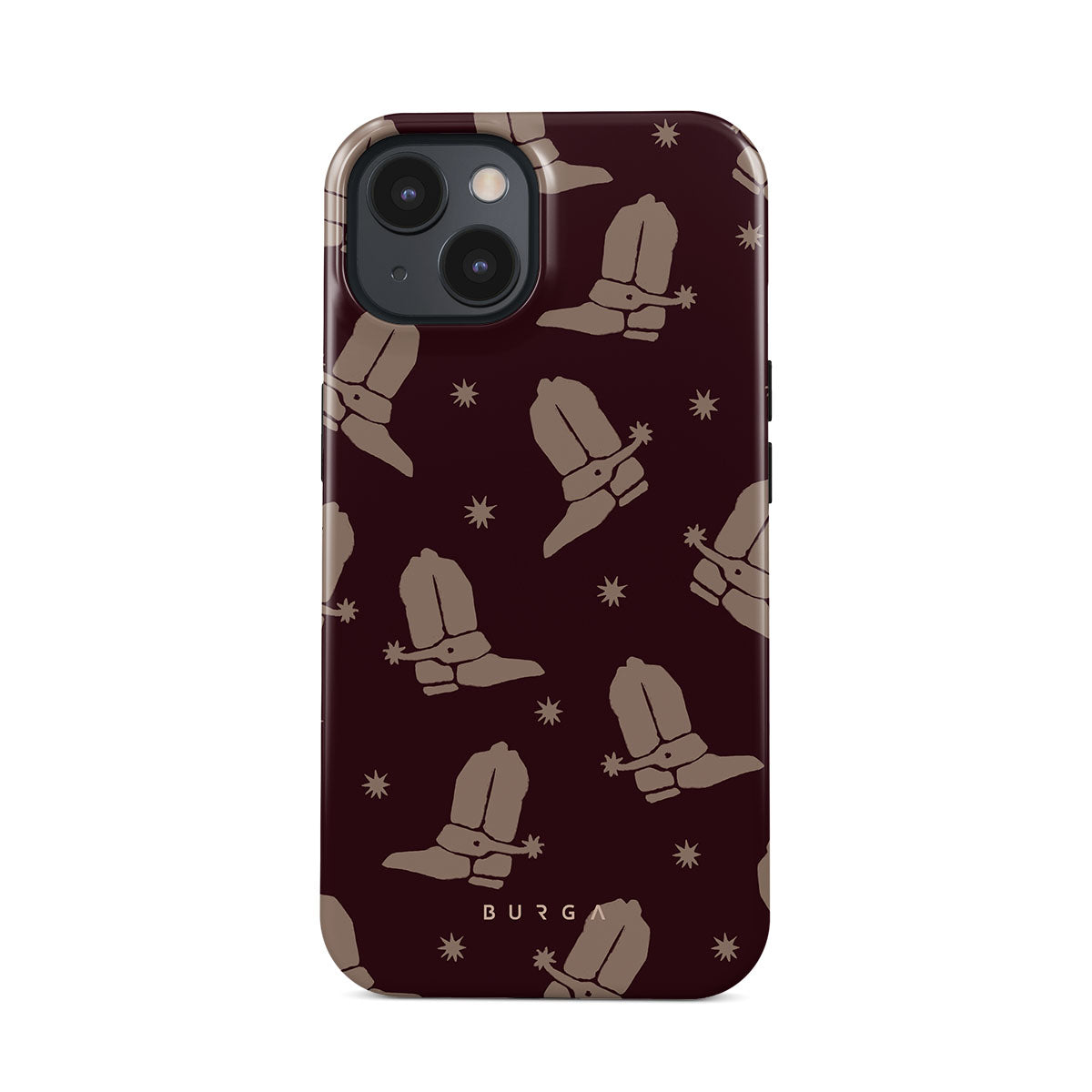 Say Howdy to this charming iPhone 15 phone case design. Cowboy boots and stars dance across a deep brown background, celebrating the essence of western life. Perfect for those who embrace their free spirit.