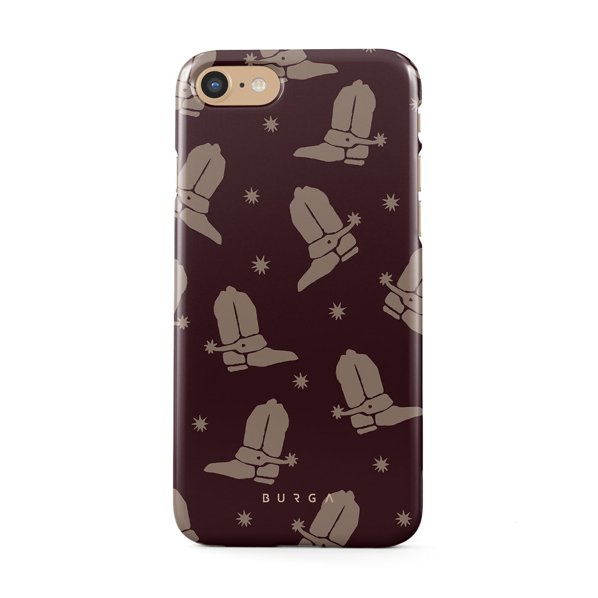 Say Howdy to this charming iPhone SE (2020) phone case design. Cowboy boots and stars dance across a deep brown background, celebrating the essence of western life. Perfect for those who embrace their free spirit.