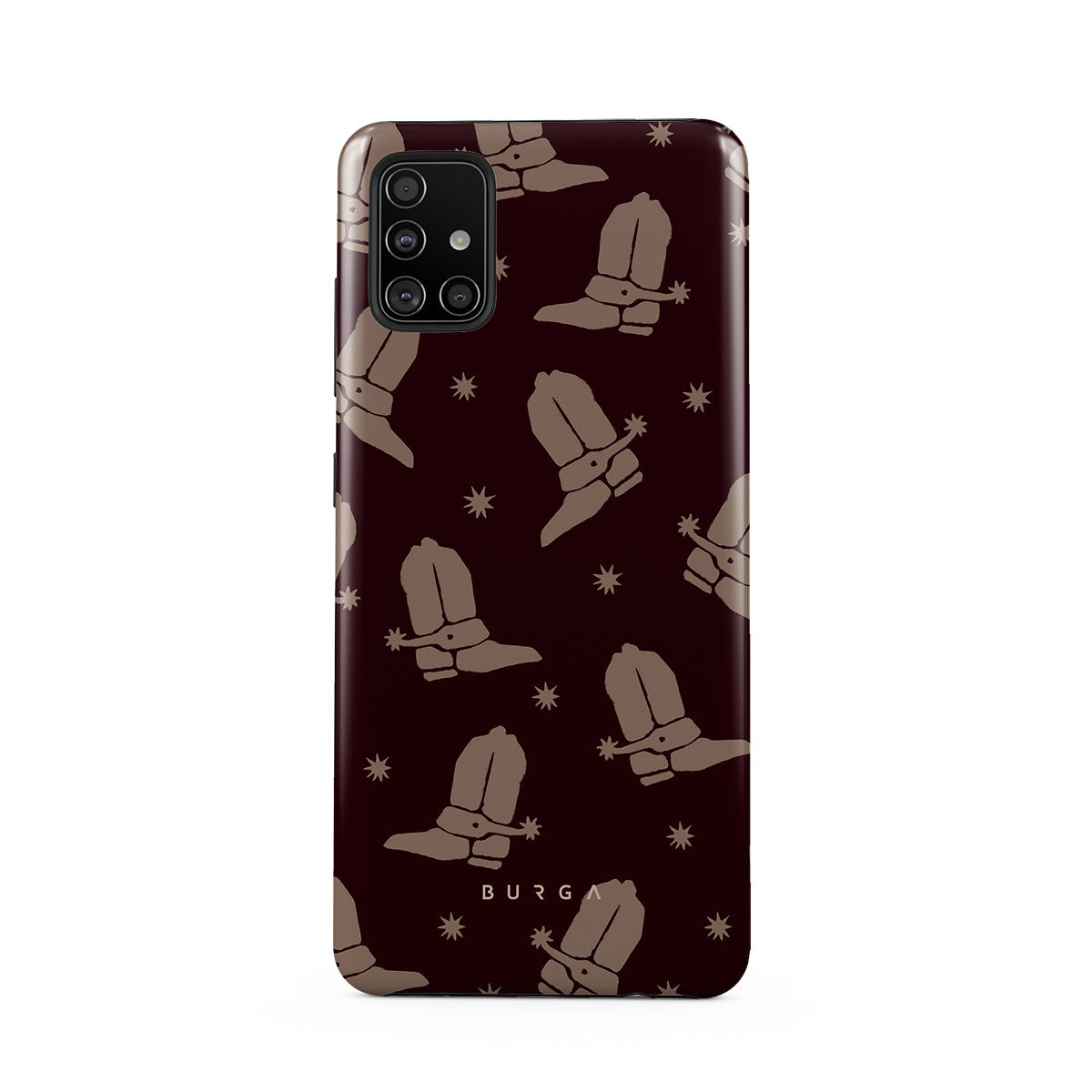 Say Howdy to this charming Samsung Galaxy A51 4G phone case design. Cowboy boots and stars dance across a deep brown background, celebrating the essence of western life. Perfect for those who embrace their free spirit.