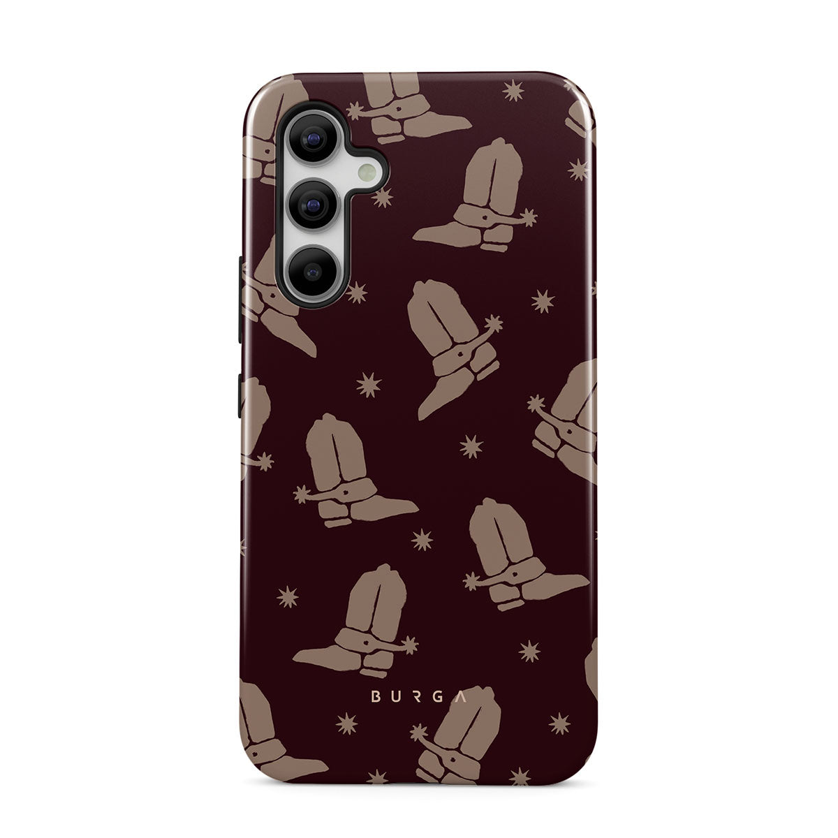 Say Howdy to this charming Samsung Galaxy A54 phone case design. Cowboy boots and stars dance across a deep brown background, celebrating the essence of western life. Perfect for those who embrace their free spirit.