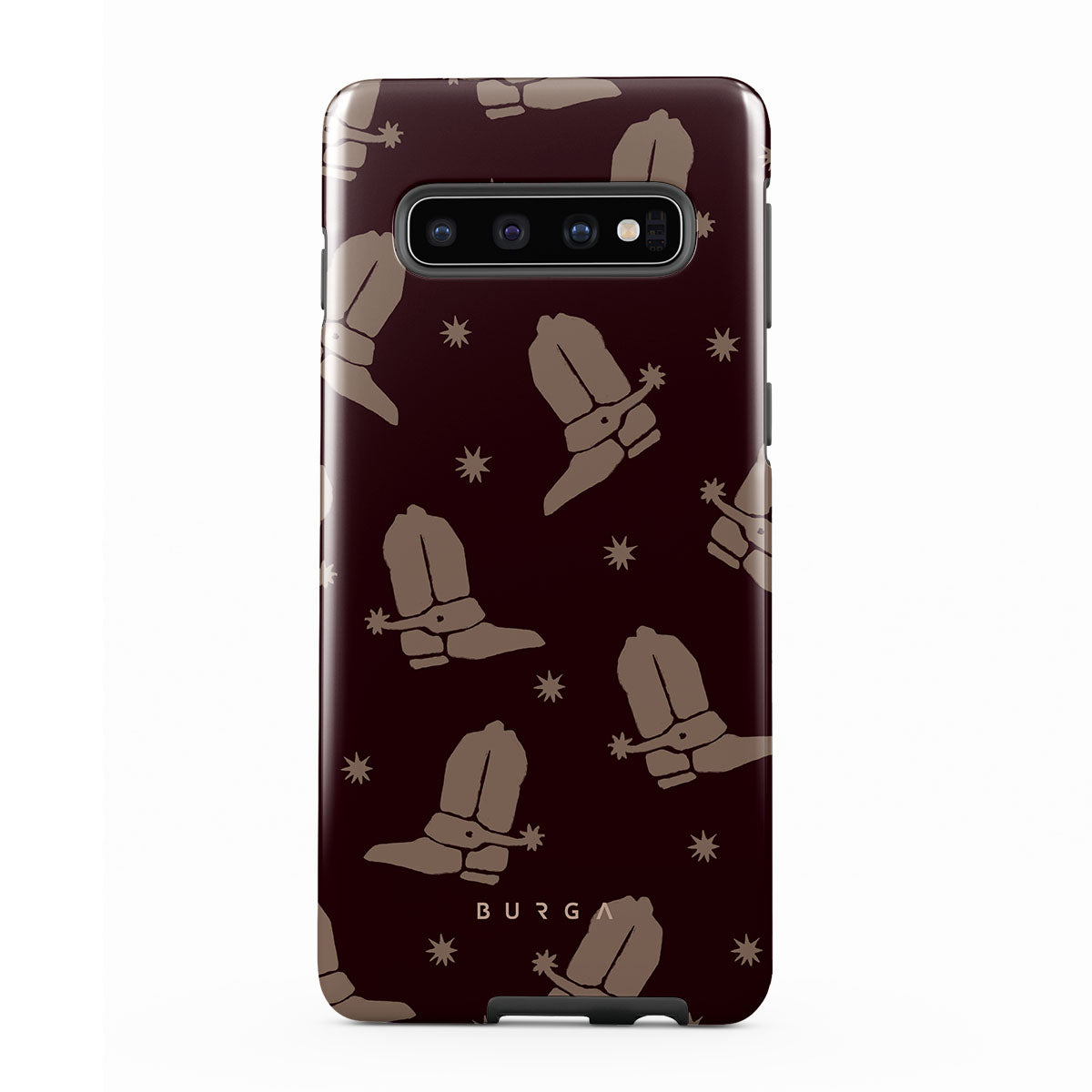 Say Howdy to this charming Samsung Galaxy S10 4G phone case design. Cowboy boots and stars dance across a deep brown background, celebrating the essence of western life. Perfect for those who embrace their free spirit.