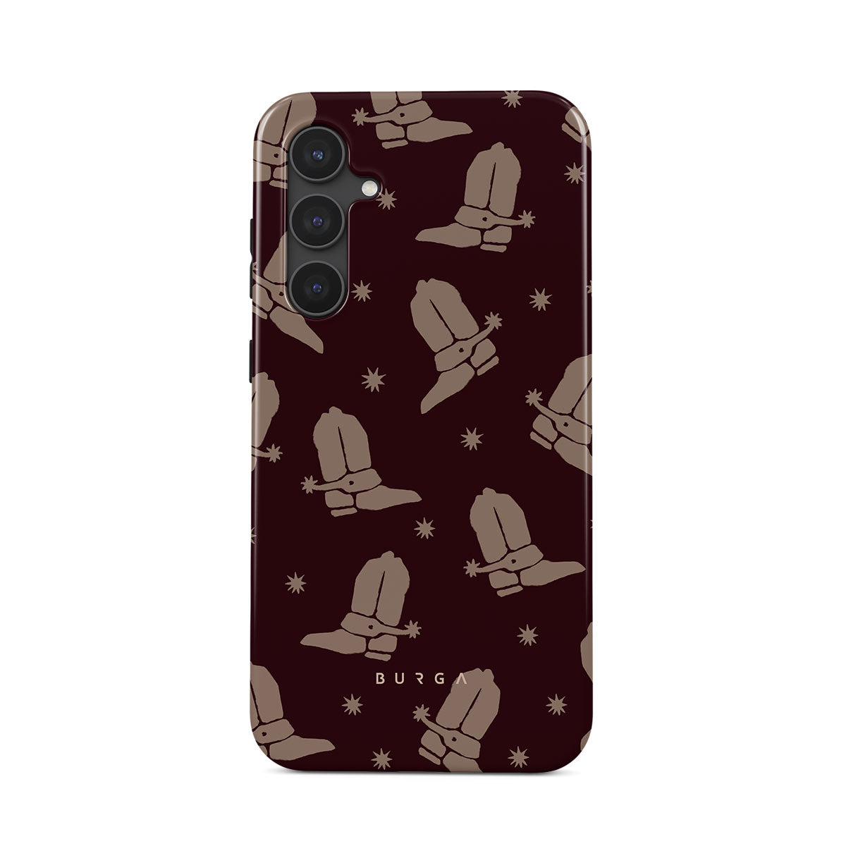 Say Howdy to this charming Samsung Galaxy S23 FE phone case design. Cowboy boots and stars dance across a deep brown background, celebrating the essence of western life. Perfect for those who embrace their free spirit.