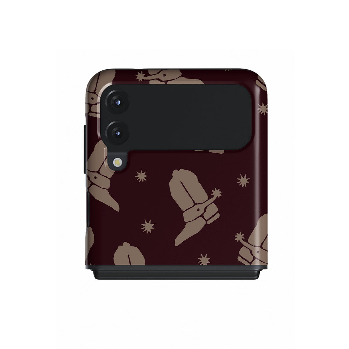 Say Howdy to this charming Samsung Galaxy Z Flip 3 phone case design. Cowboy boots and stars dance across a deep brown background, celebrating the essence of western life. Perfect for those who embrace their free spirit.