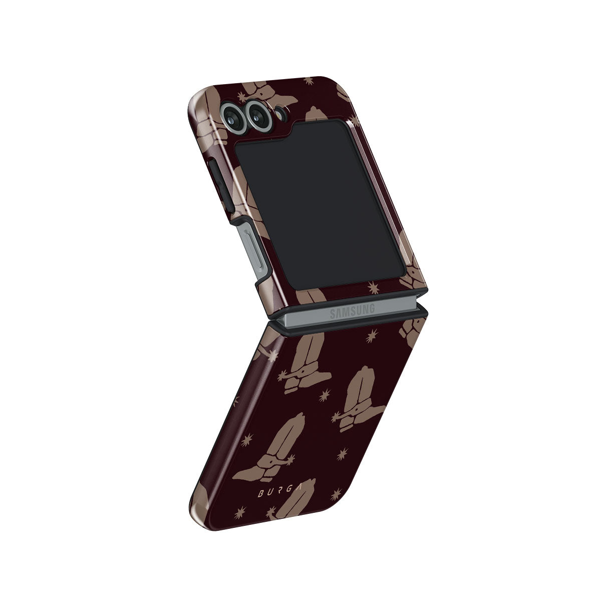 Say Howdy to this charming Samsung Galaxy Z Flip 6 phone case design. Cowboy boots and stars dance across a deep brown background, celebrating the essence of western life. Perfect for those who embrace their free spirit.