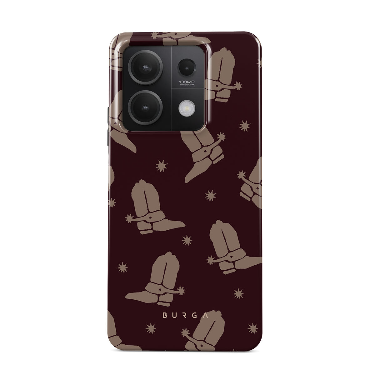Say Howdy to this charming Xiaomi Redmi Note 13 5G phone case design. Cowboy boots and stars dance across a deep brown background, celebrating the essence of western life. Perfect for those who embrace their free spirit.
