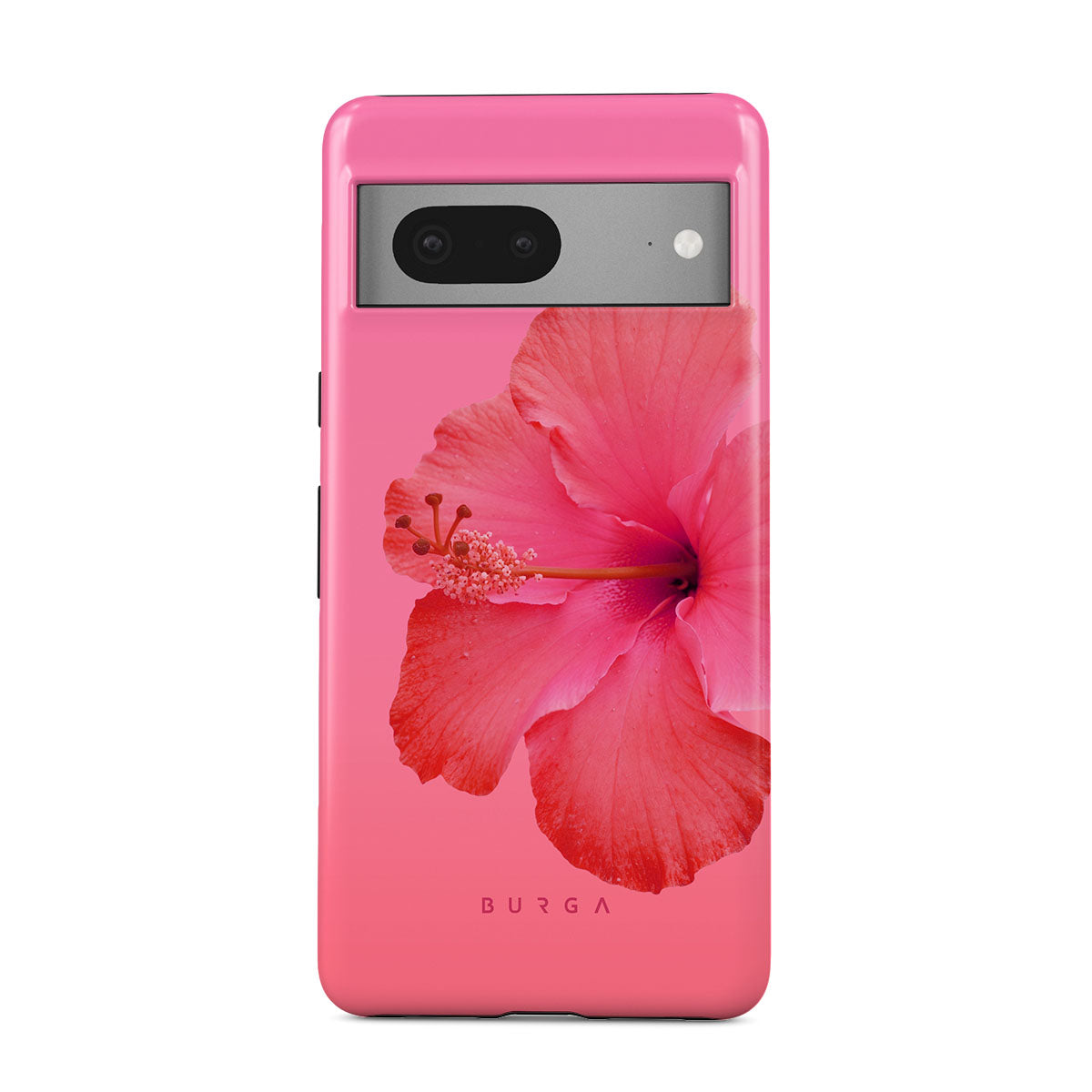 Our Island Girl Google Pixel 7a phone case design bursts with the fiery red of a hibiscus in full bloom against a dreamy pink backdrop. Perfect for those who embody the spirit of a sun-kissed island retreat.