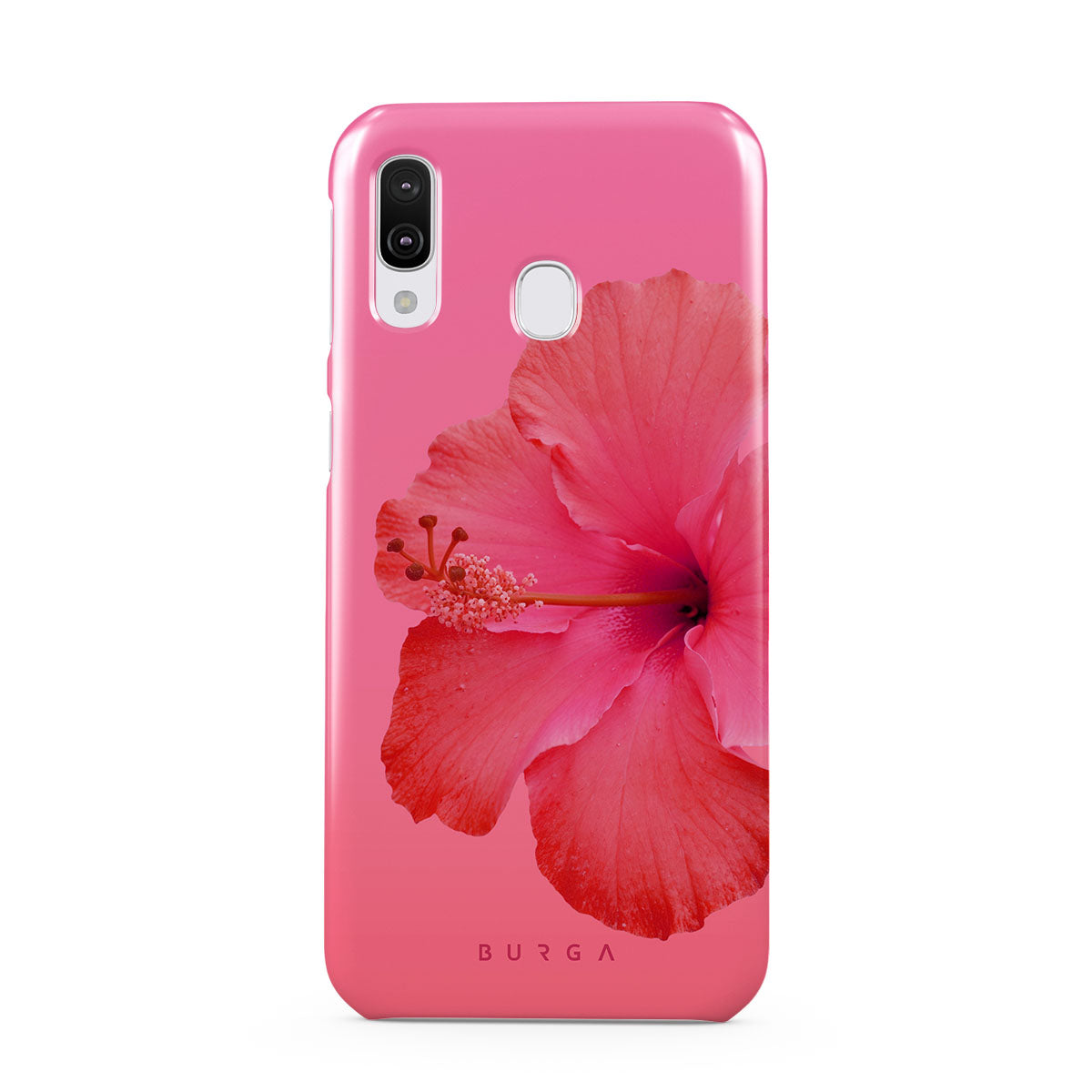 Our Island Girl Samsung Galaxy A40 phone case design bursts with the fiery red of a hibiscus in full bloom against a dreamy pink backdrop. Perfect for those who embody the spirit of a sun-kissed island retreat.