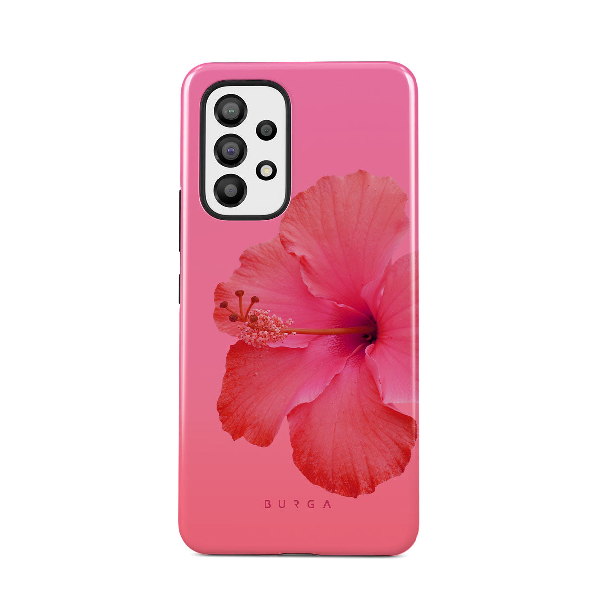 Our Island Girl Samsung Galaxy A53 phone case design bursts with the fiery red of a hibiscus in full bloom against a dreamy pink backdrop. Perfect for those who embody the spirit of a sun-kissed island retreat.