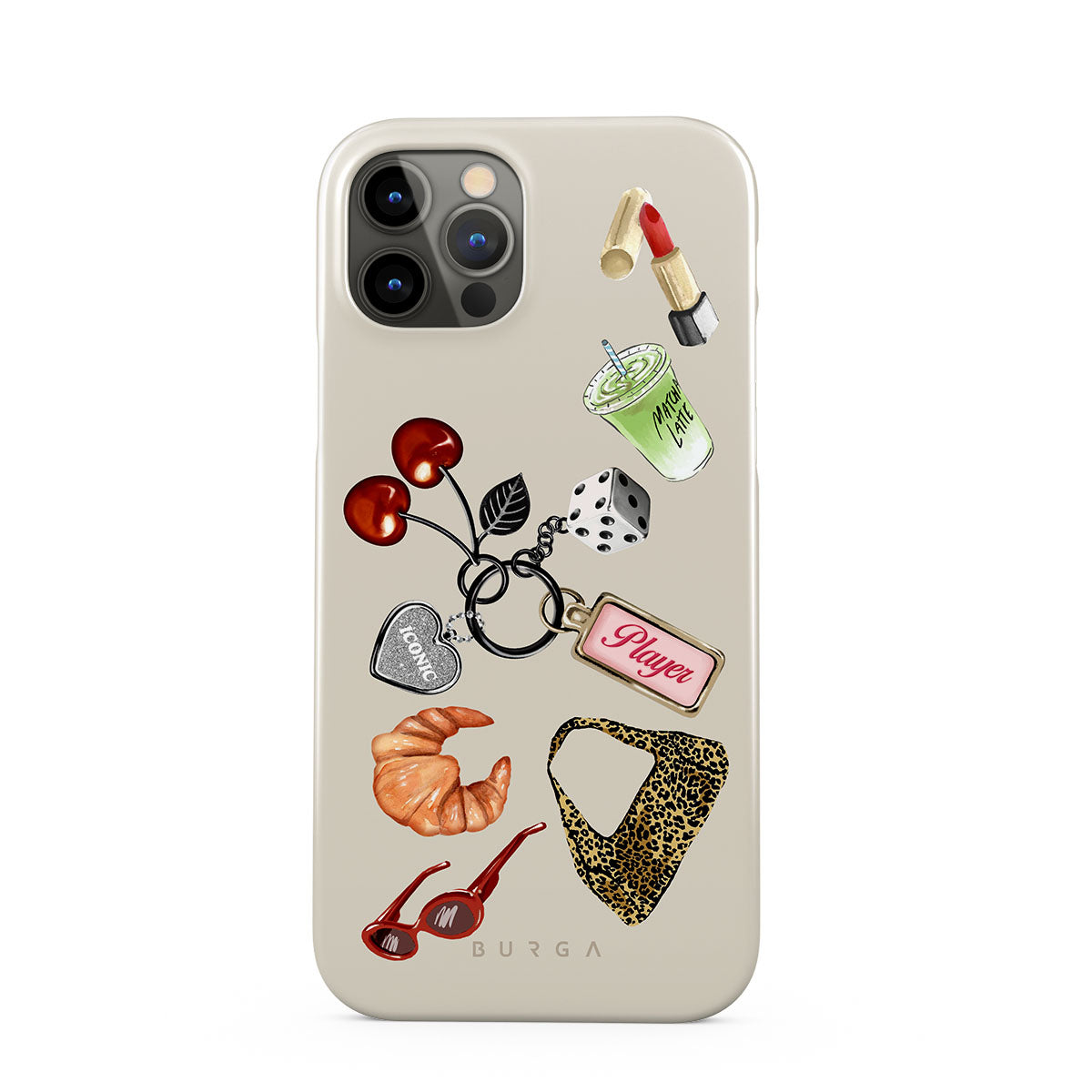 This design features: red sunglasses, red lipstick, green matcha drink, croissant, black dice, leopard-print bag, keychain with silver heart, cherries, dice and "Player" tag