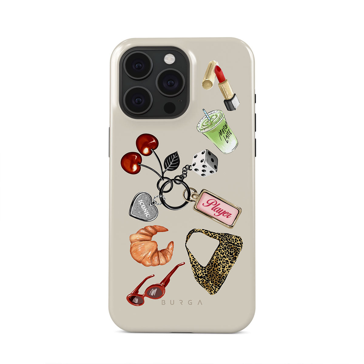 This design features: red sunglasses, red lipstick, green matcha drink, croissant, black dice, leopard-print bag, keychain with silver heart, cherries, dice and "Player" tag