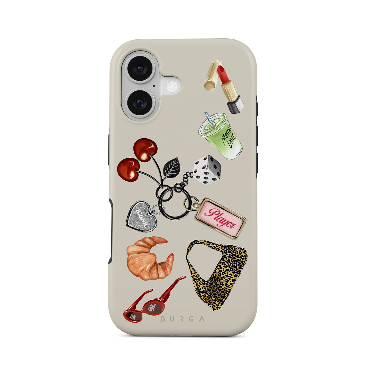 This design features: red sunglasses, red lipstick, green matcha drink, croissant, black dice, leopard-print bag, keychain with silver heart, cherries, dice and "Player" tag