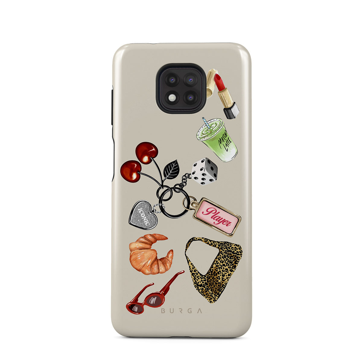 This design features: red sunglasses, red lipstick, green matcha drink, croissant, black dice, leopard-print bag, keychain with silver heart, cherries, dice and "Player" tag