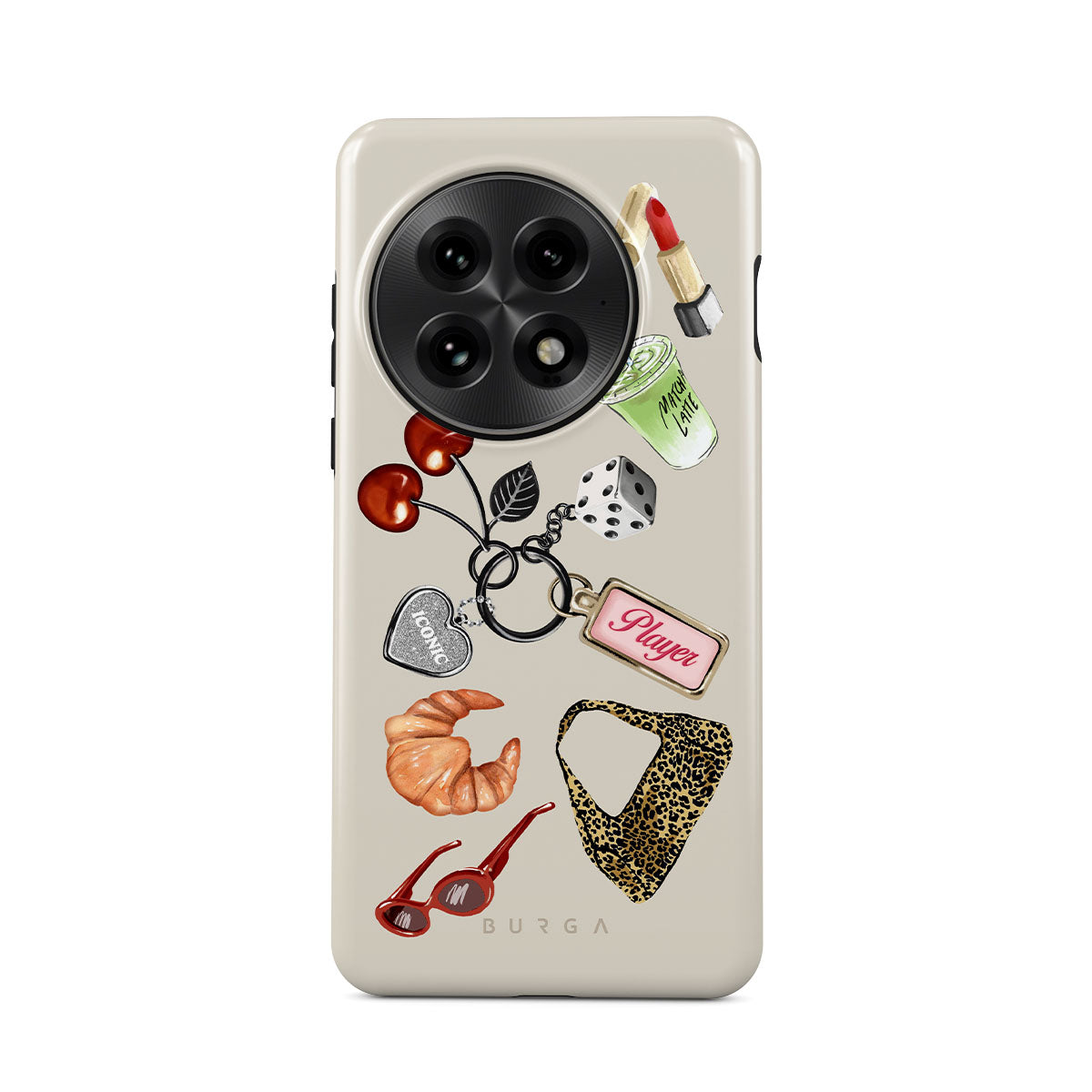 This design features: red sunglasses, red lipstick, green matcha drink, croissant, black dice, leopard-print bag, keychain with silver heart, cherries, dice and "Player" tag