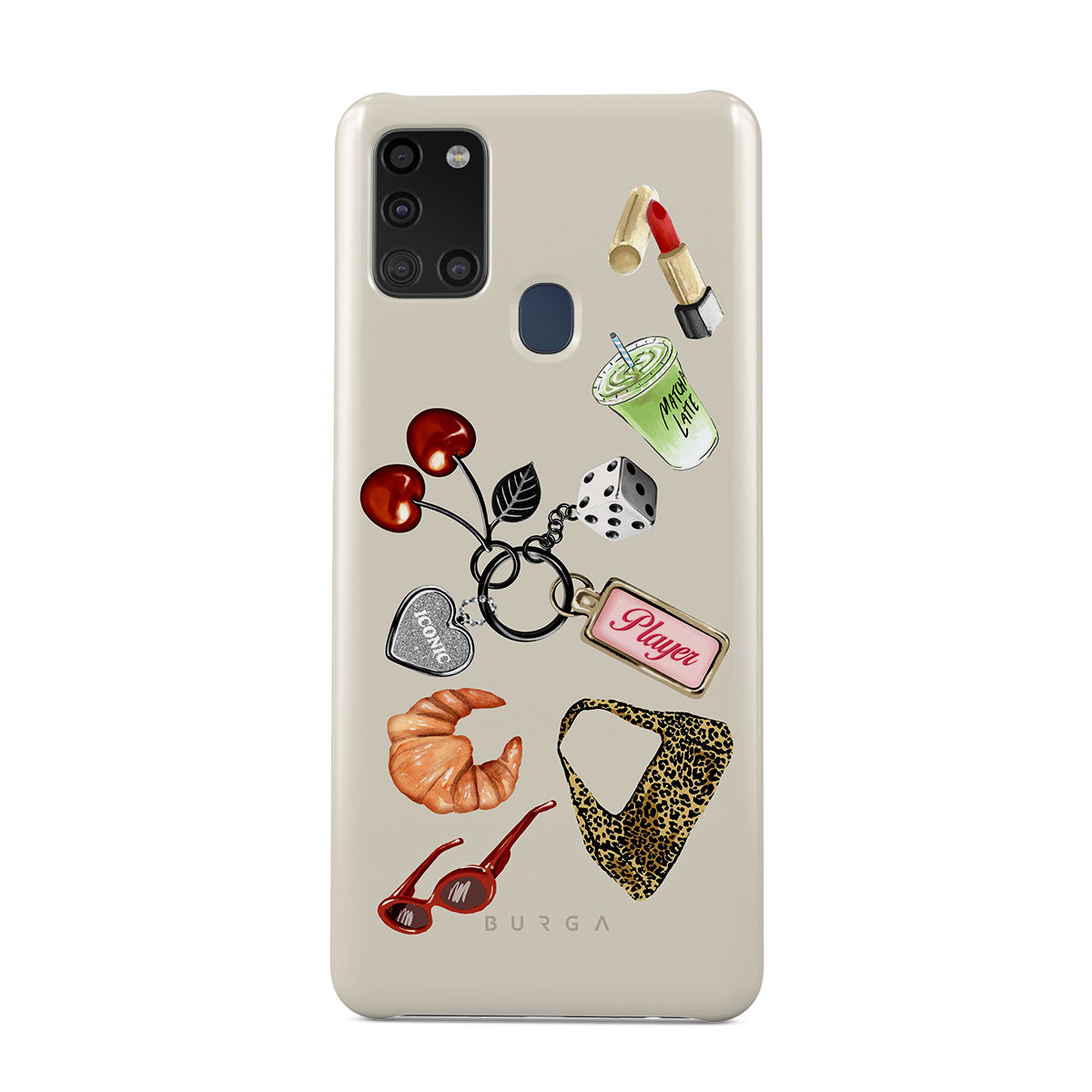 This design features: red sunglasses, red lipstick, green matcha drink, croissant, black dice, leopard-print bag, keychain with silver heart, cherries, dice and "Player" tag