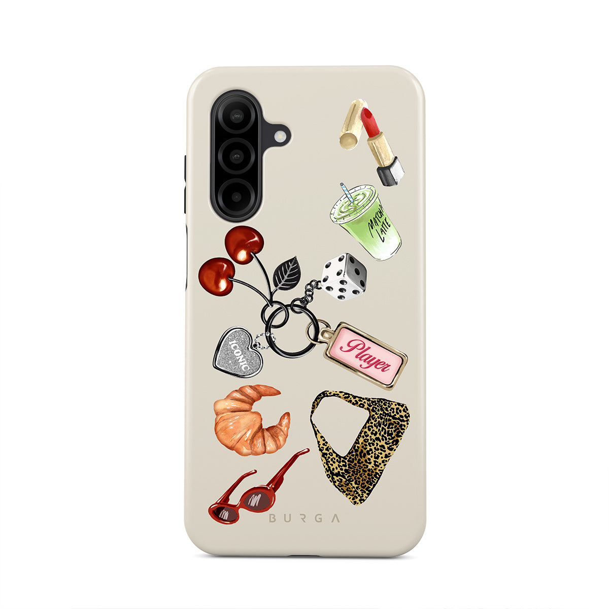 This design features: red sunglasses, red lipstick, green matcha drink, croissant, black dice, leopard-print bag, keychain with silver heart, cherries, dice and "Player" tag