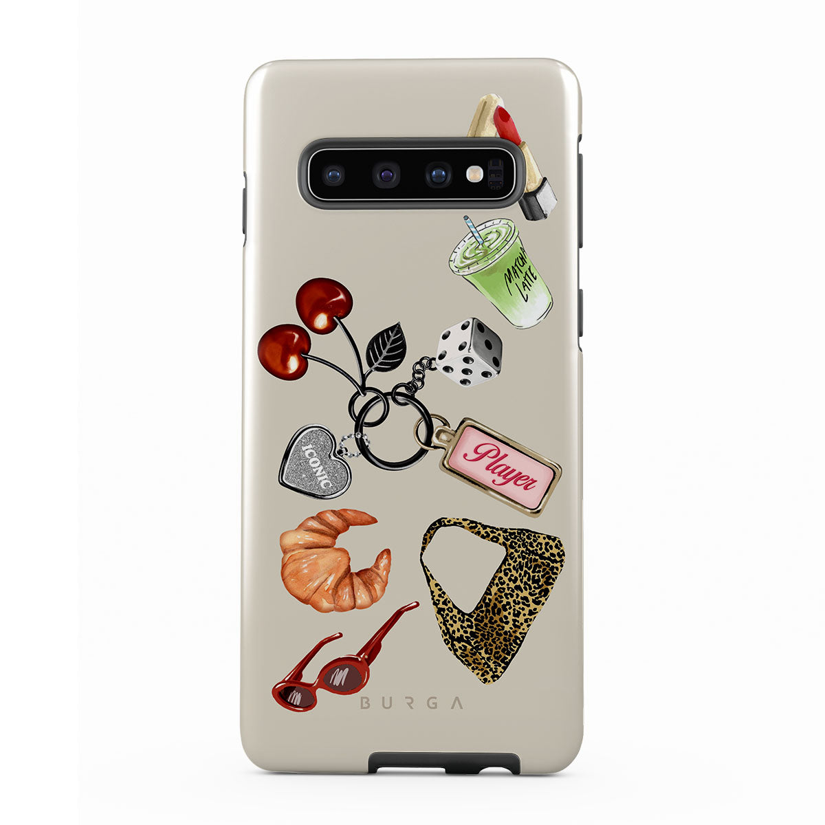 This design features: red sunglasses, red lipstick, green matcha drink, croissant, black dice, leopard-print bag, keychain with silver heart, cherries, dice and "Player" tag
