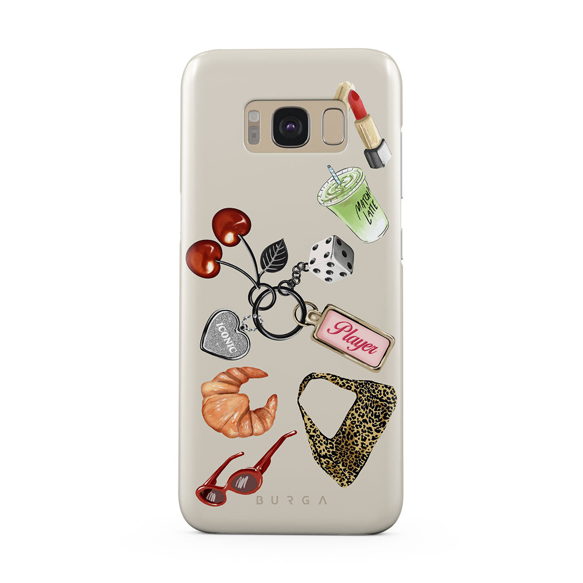 This design features: red sunglasses, red lipstick, green matcha drink, croissant, black dice, leopard-print bag, keychain with silver heart, cherries, dice and "Player" tag