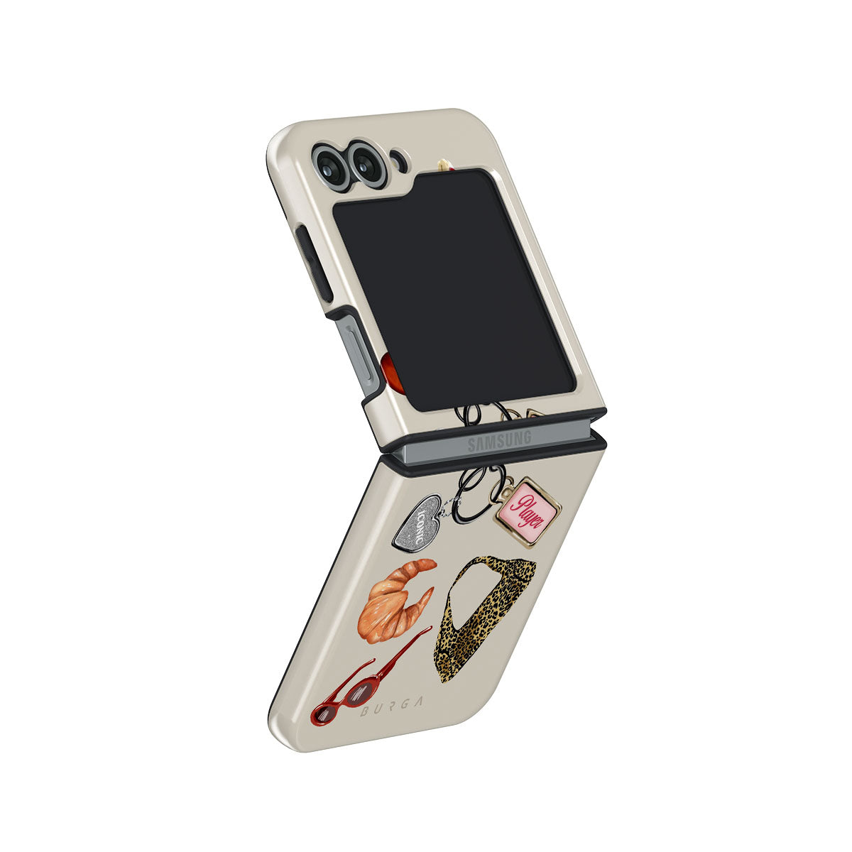 This design features: red sunglasses, red lipstick, green matcha drink, croissant, black dice, leopard-print bag, keychain with silver heart, cherries, dice and "Player" tag