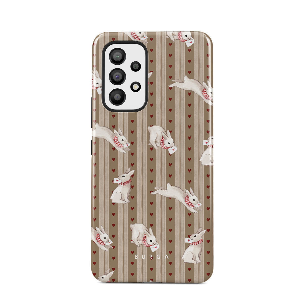 The Late Again Samsung Galaxy A53 phone case design is a love letter lost in time—scattered hearts, hurried notes, and white rabbits racing against a clock that refuses to be tamed. Sent, but never received. Read, but never answered. Always running, always chasing, always just a moment too late.