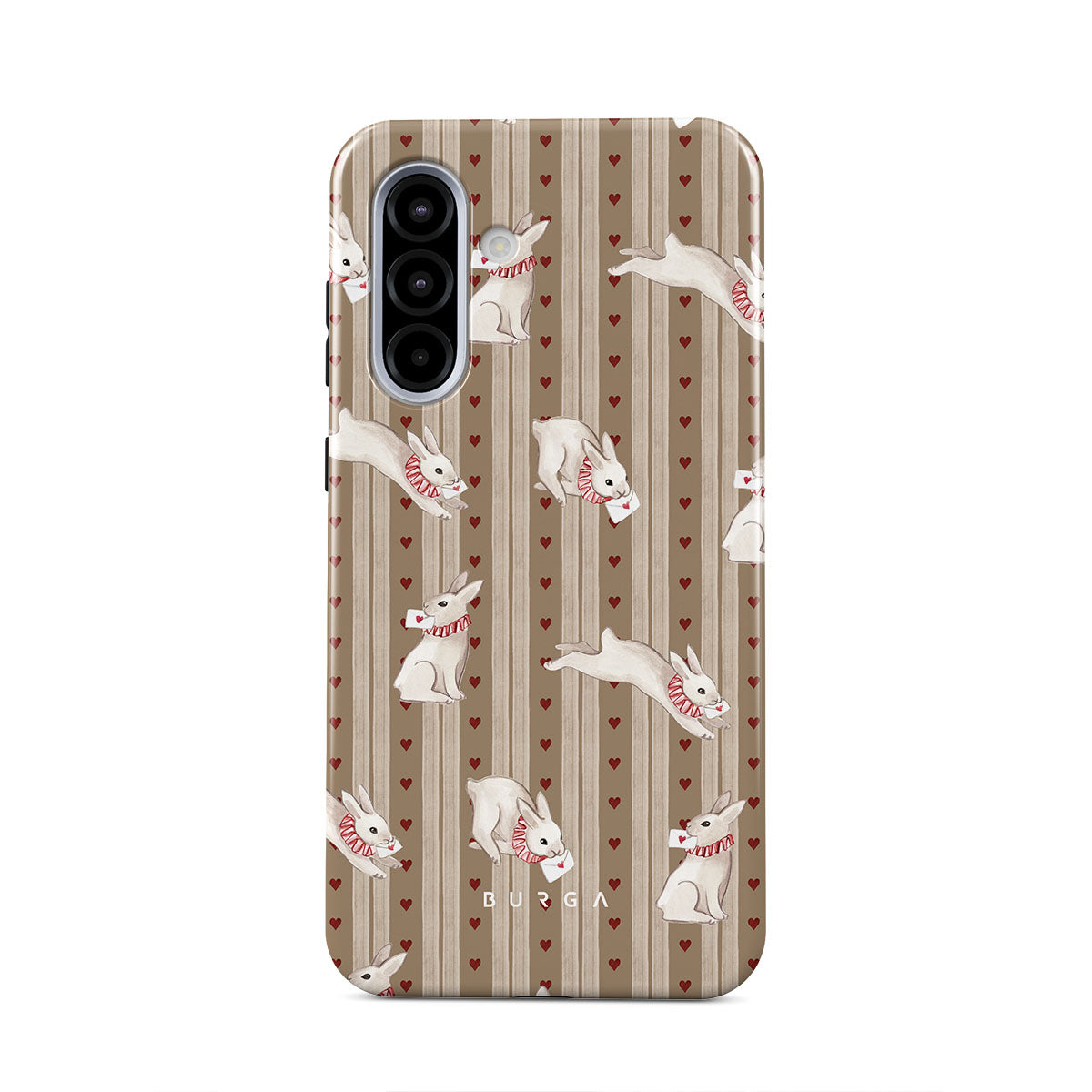 The Late Again Samsung Galaxy A56 5G phone case design is a love letter lost in time—scattered hearts, hurried notes, and white rabbits racing against a clock that refuses to be tamed. Sent, but never received. Read, but never answered. Always running, always chasing, always just a moment too late.