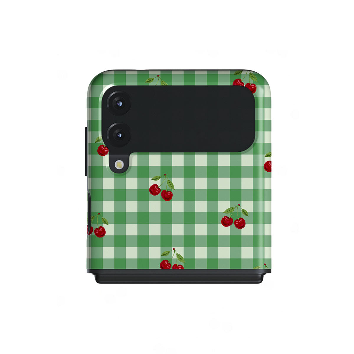 The Little Life Samsung Galaxy Z Flip 3 phone case design: green checks, simple and true, like a patch of grass under a tree, where you can sit and watch the small world go by, every leaf a chapter in nature’s story.