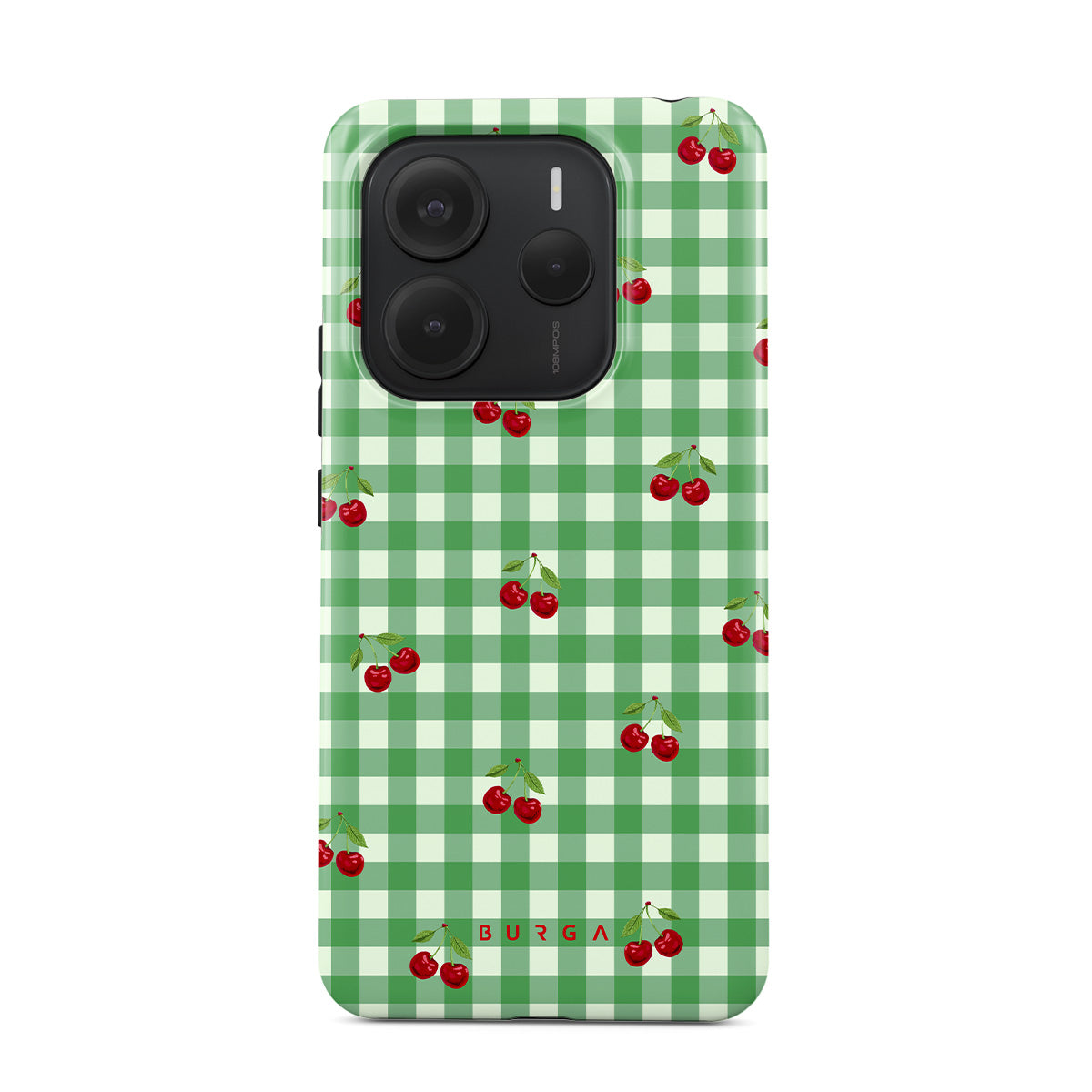 The Little Life Xiaomi Redmi Note 14 5G phone case design: green checks, simple and true, like a patch of grass under a tree, where you can sit and watch the small world go by, every leaf a chapter in nature’s story.