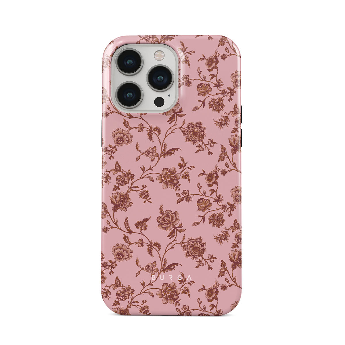 The Lover iPhone 14 Pro Max phone case design: because you're a Lover, not a fighter. Delicate floral motifs across a soft pink background capture the essence of timeless beauty and rustic elegance. Perfect for modern-day cowgirls with a vintage heart.