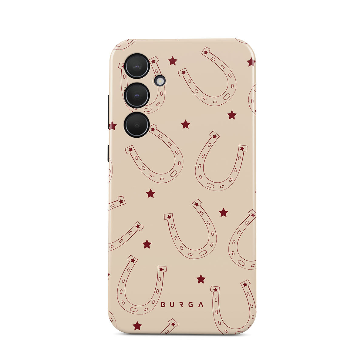 Horseshoes for luck, stars for style. Keep fortune on your side with our Lucky Charm Samsung Galaxy A35 phone case. This design is a playful take on traditional symbols of luck. The earthy tones make it a versatile accessory for any western-inspired outfit—and not only.
