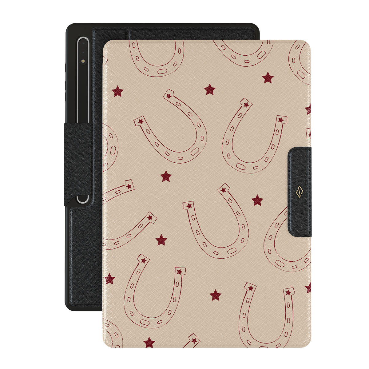 Horseshoes for luck, stars for style. Keep fortune on your side with our Lucky Charm Samsung Galaxy Tab S10 Ultra folio case . This design is a playful take on traditional symbols of luck. The earthy tones make it a versatile accessory for any western-inspired outfit—and not only.