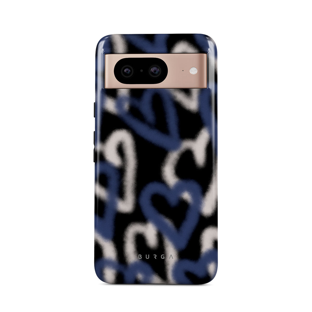 The Lucky You Google Pixel 8 phone case captures the raw, unfiltered pulse of street art. Graffiti hearts in striking blue and white stand out against a black background, their edges softly faded. It’s a design that speaks to the restless who find beauty in chaos and dare to be different.