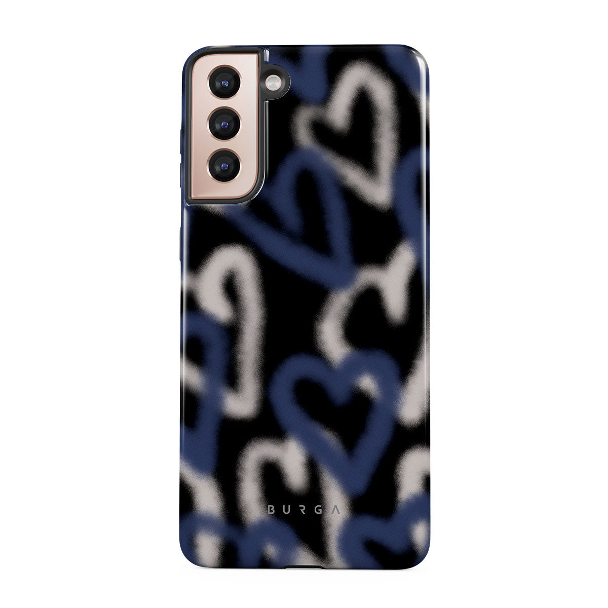 The Lucky You Samsung Galaxy S21 Plus phone case captures the raw, unfiltered pulse of street art. Graffiti hearts in striking blue and white stand out against a black background, their edges softly faded. It’s a design that speaks to the restless who find beauty in chaos and dare to be different.