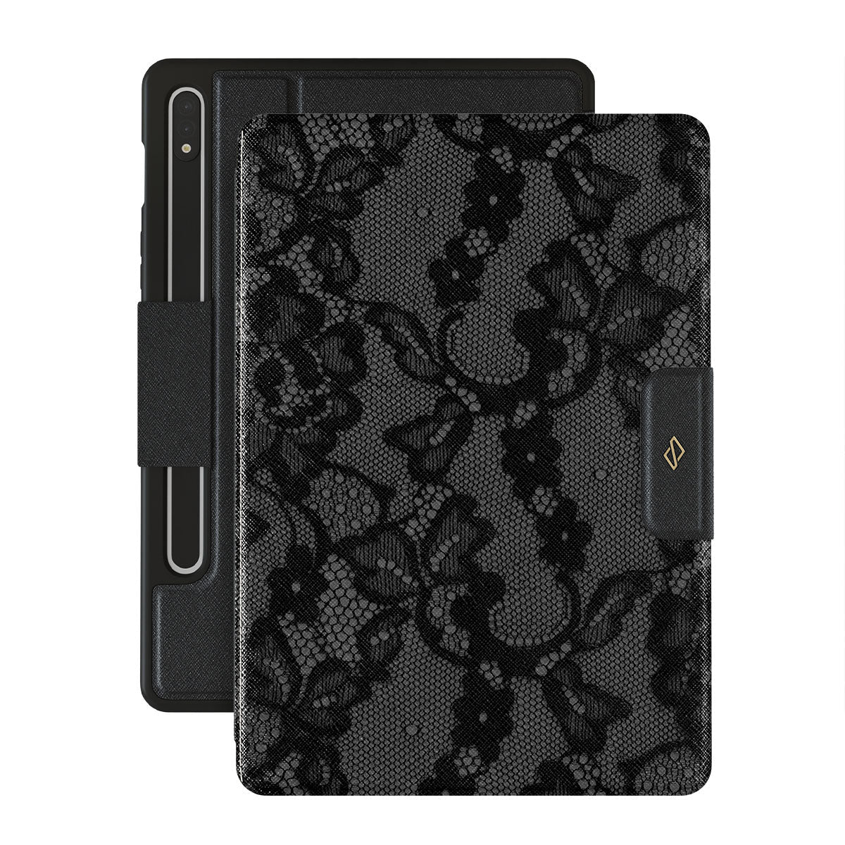 Inspired by the intricate patterns of lace gowns, our Magnetic design is perfect for those with a love for the drama and romance of old Hollywood. This Samsung Galaxy Tab S9+ FE folio caseis a statement of effortless, mysterious femininity, turning you into the main character where you go.