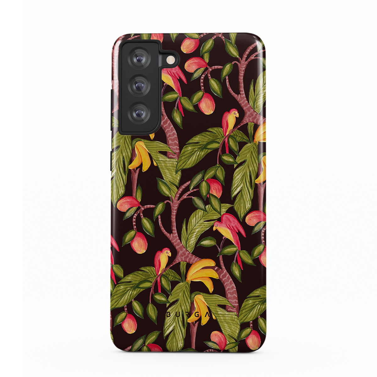 A lush botanical fantasy where ripe mangoes hang like forbidden fruit. Deep greens and juicy oranges pull you into a tropical escape. If this Samsung Galaxy S21 FE phone case design had a voice, it would purr.