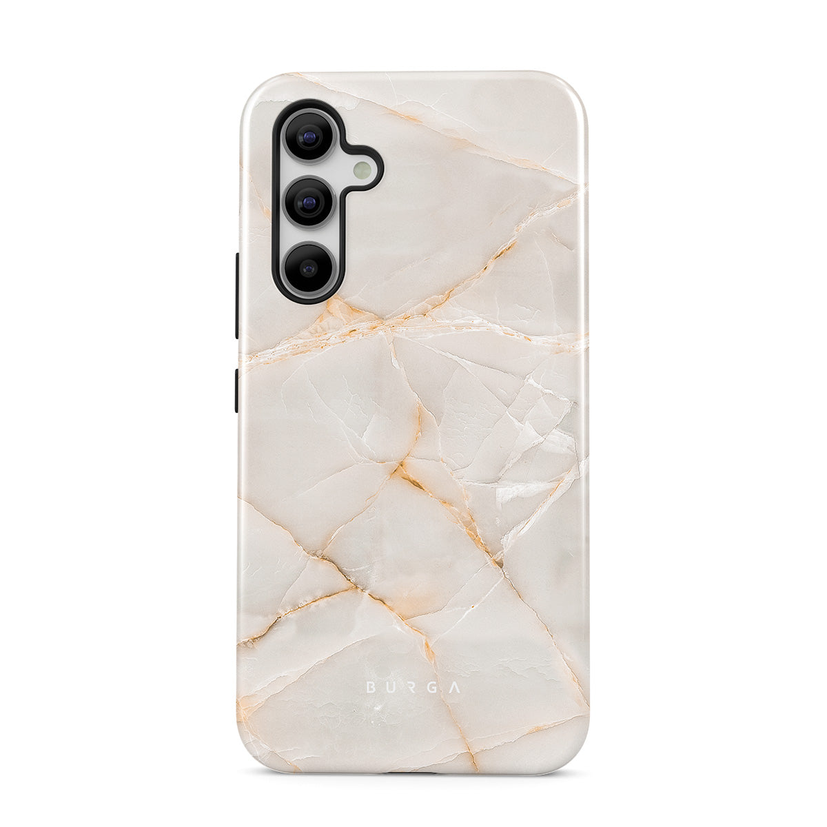 The Vanilla Sand Marble Samsung Galaxy A51 phone case cover features a marble design with creamy canvas showcasing beautiful golden hues. The soft-toned case will add a touch of luxury to the device while protecting it from dangerous falls.