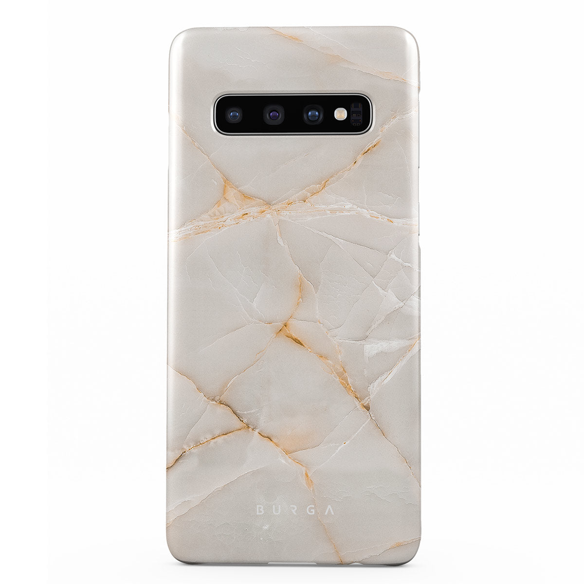 The Vanilla Sand Marble Samsung Galaxy S10 Plus phone case cover features a marble design with creamy canvas showcasing beautiful golden hues. The soft-toned case will add a touch of luxury to the device while protecting it from dangerous falls.