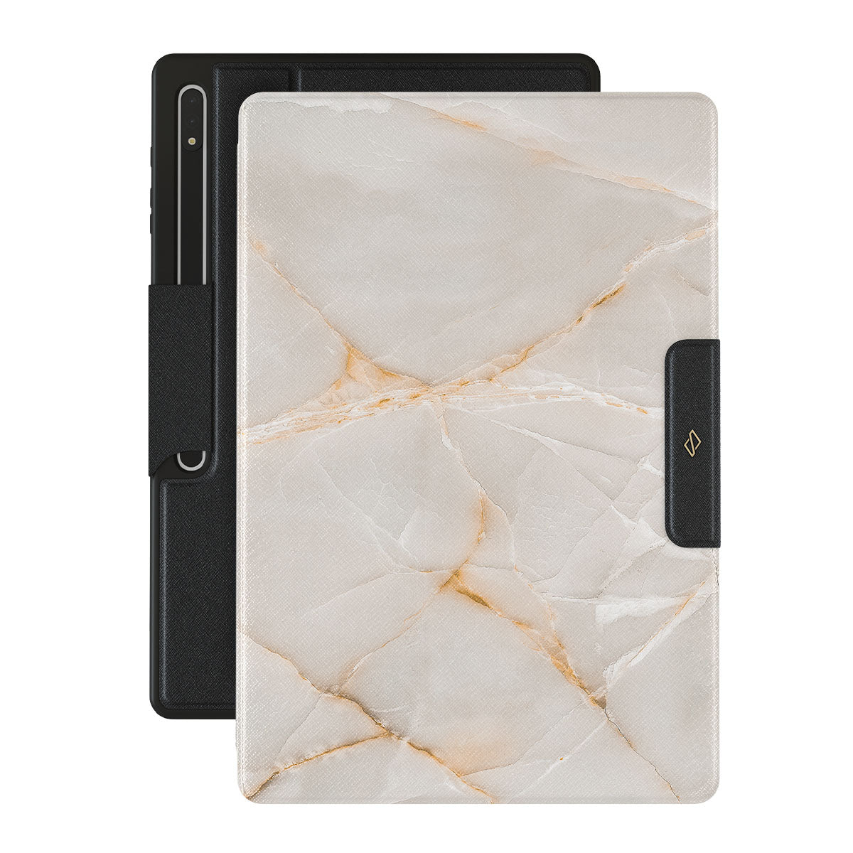 The Vanilla Sand Marble Samsung Galaxy Tab S10 Ultra folio case cover features a marble design with creamy canvas showcasing beautiful golden hues. The soft-toned case will add a touch of luxury to the device while protecting it from dangerous falls.