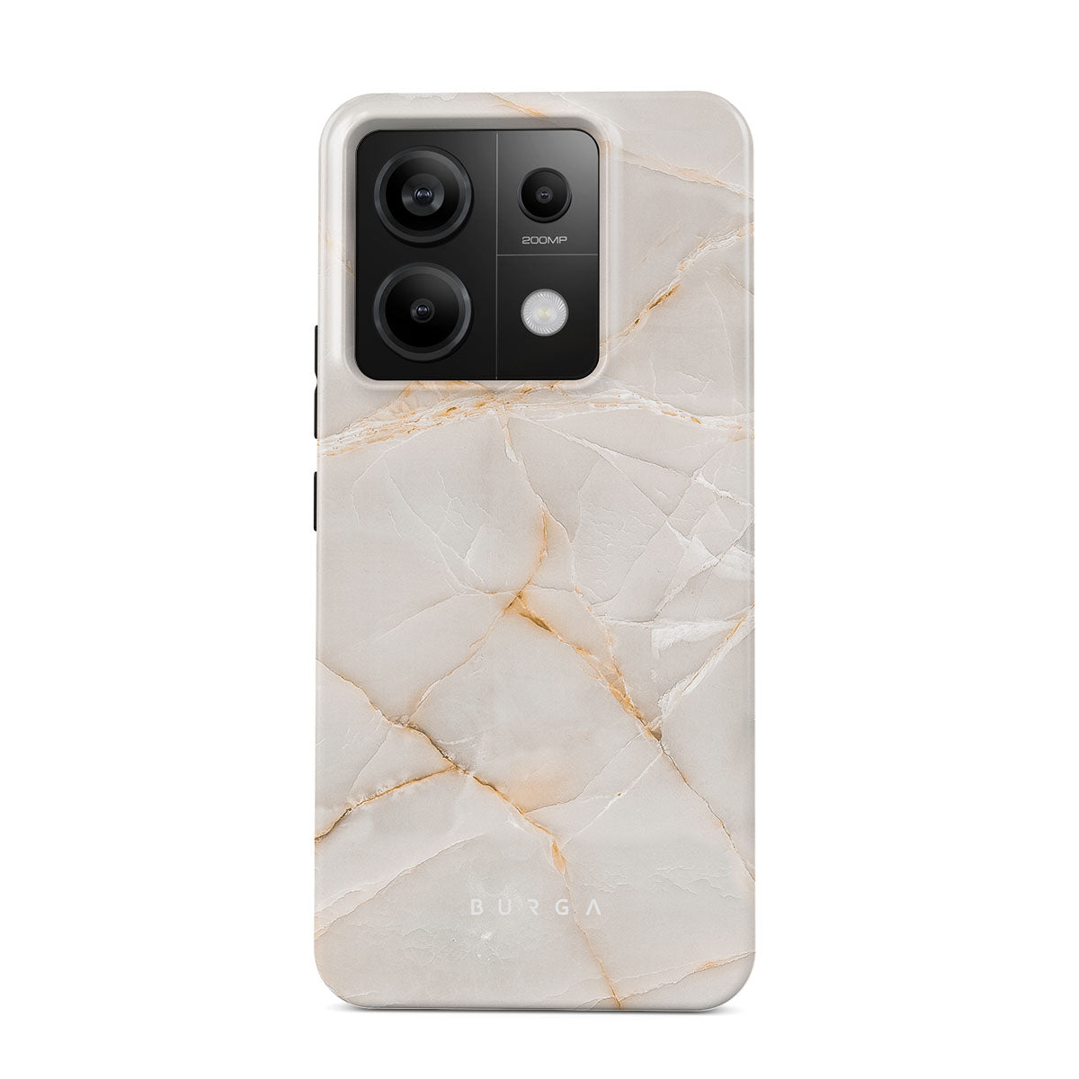 The Vanilla Sand Marble Xiaomi Redmi Note 13 Pro 5G phone case cover features a marble design with creamy canvas showcasing beautiful golden hues. The soft-toned case will add a touch of luxury to the device while protecting it from dangerous falls.