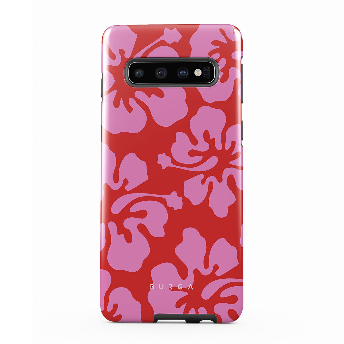 Dive into a sea of floral fantasy with Me Gustas Tu. Featuring oversized coral-toned blooms against a fiery backdrop, this Samsung Galaxy S10 4G phone case design captures the wild heart of tropical flowers—perfect for those who want to carry a touch of exotic flair.