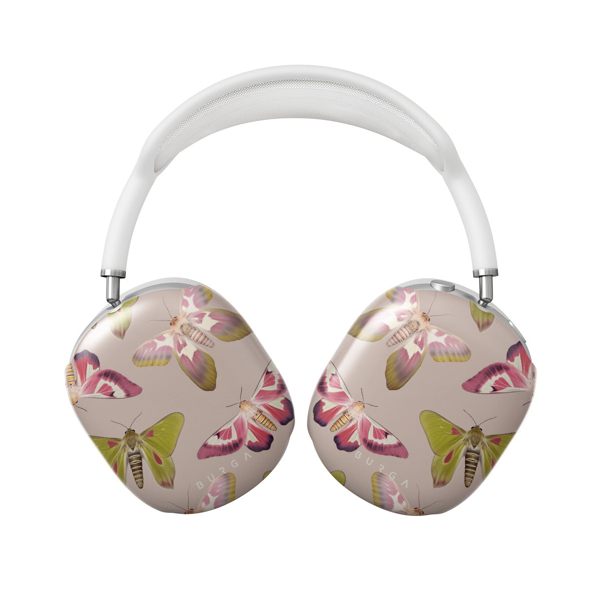 A tapestry of muted-toned moths — their wing patterns echoing tales of transformation and resilience found in nature's delicate beings. These moths, wings wide, serve as silent mentors, teaching us that every phase of life and change holds its own magic and mystery. Discover our Metamorphosis Apple AirPods Max case coverdesign.