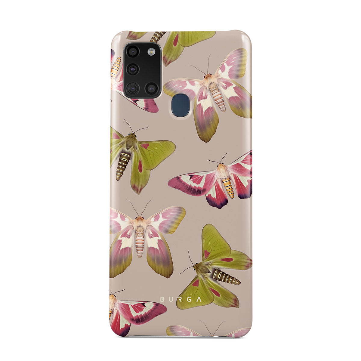 A tapestry of muted-toned moths — their wing patterns echoing tales of transformation and resilience found in nature's delicate beings. These moths, wings wide, serve as silent mentors, teaching us that every phase of life and change holds its own magic and mystery. Discover our Metamorphosis Samsung Galaxy A21s 4G phone casedesign.