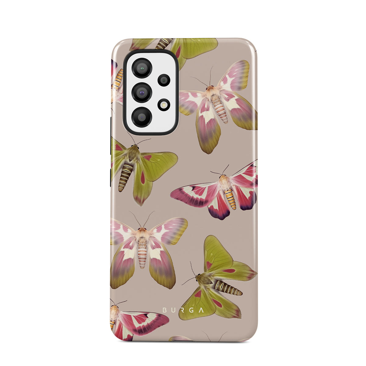 A tapestry of muted-toned moths — their wing patterns echoing tales of transformation and resilience found in nature's delicate beings. These moths, wings wide, serve as silent mentors, teaching us that every phase of life and change holds its own magic and mystery. Discover our Metamorphosis Samsung Galaxy A33 phone casedesign.