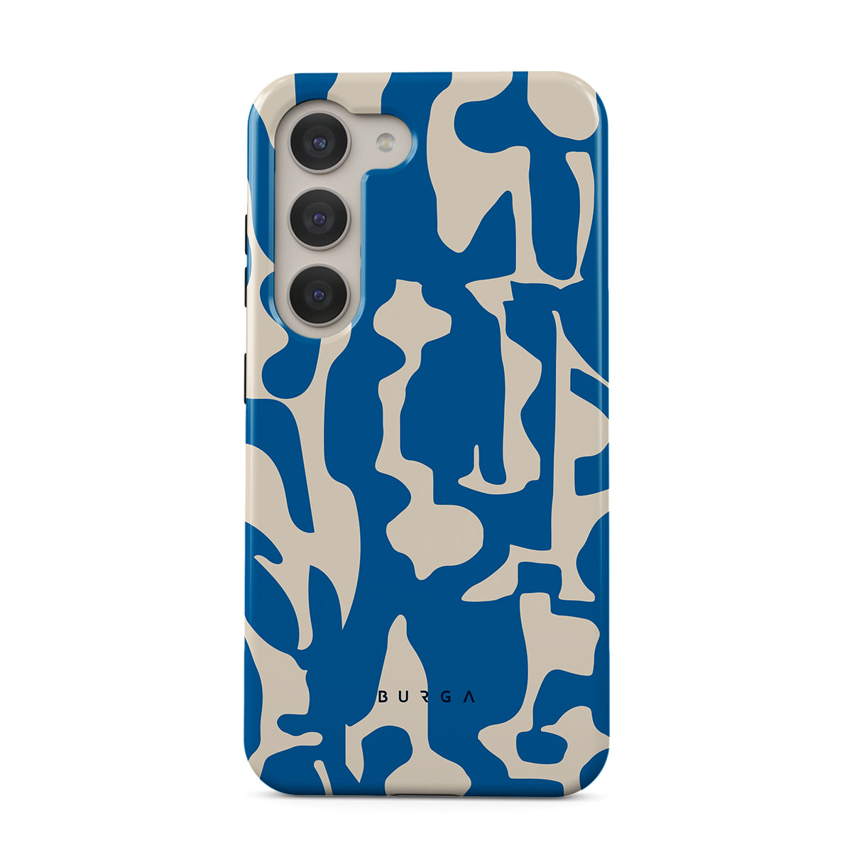 Indulge in the exquisite elegance of Mirage. Against a canvas of deep, enigmatic blue, luminous shapes gracefully disrupt the darkness, creating a captivating visual spectacle. Let this Samsung Galaxy S23 phone case be a symbol of your impeccable taste and magnetic charm.