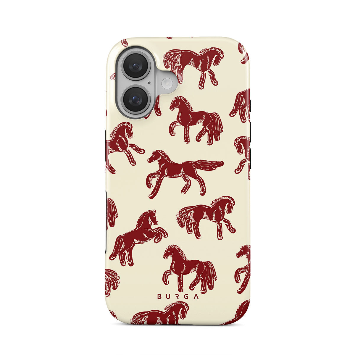 It's time to unleash your wild side with the Mustang design. Bold red horses gallop across a nude background, capturing the spirit of untamed adventure. This iPhone 16 Plus phone case is perfect for the free-spirited souls ready to ride into the unknown.