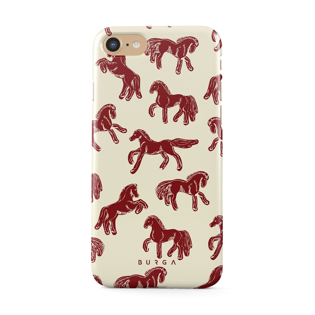 It's time to unleash your wild side with the Mustang design. Bold red horses gallop across a nude background, capturing the spirit of untamed adventure. This iPhone SE (2020) phone case is perfect for the free-spirited souls ready to ride into the unknown.